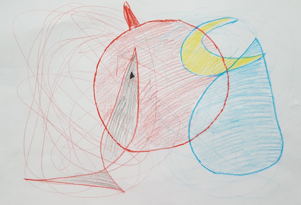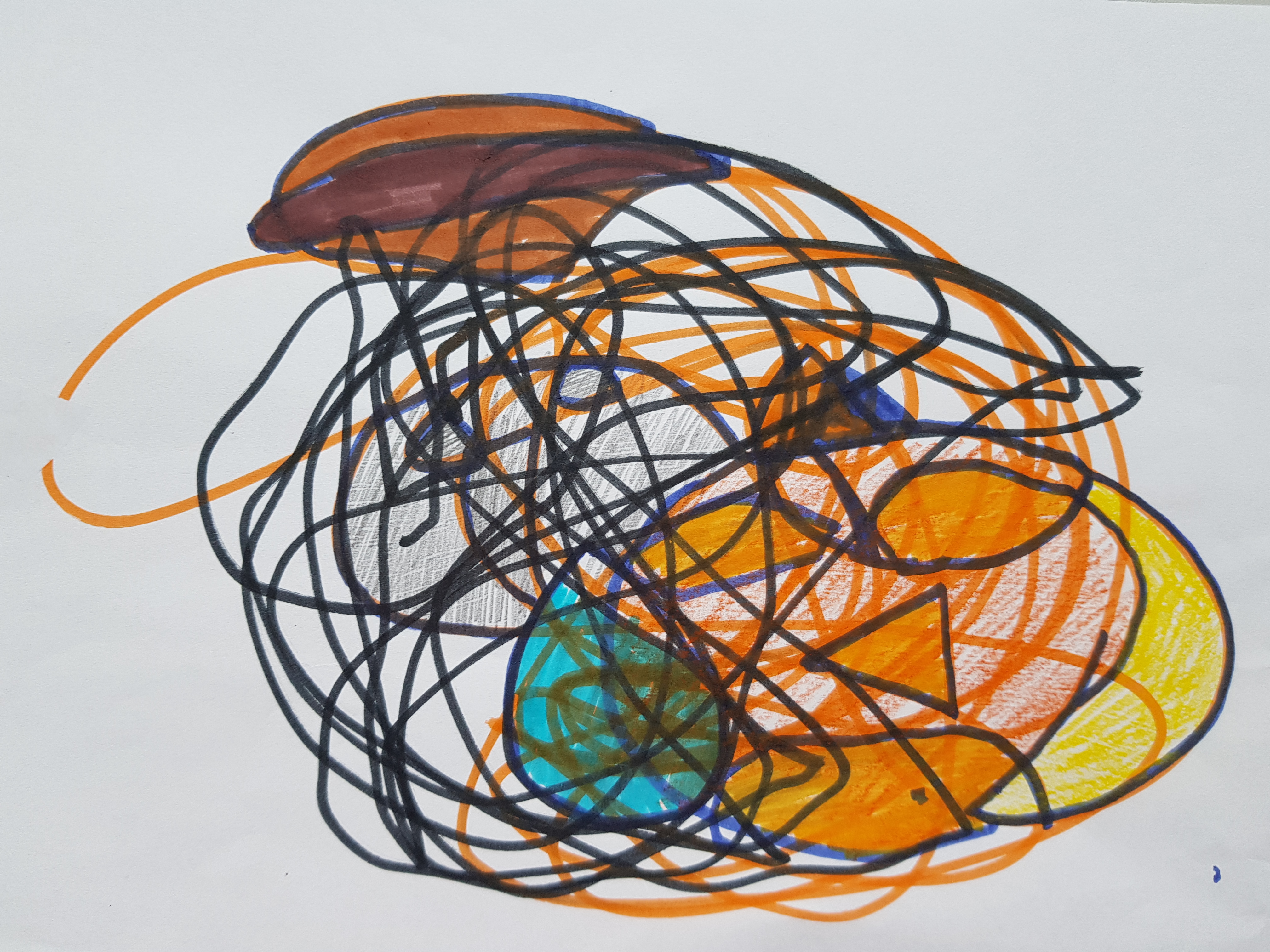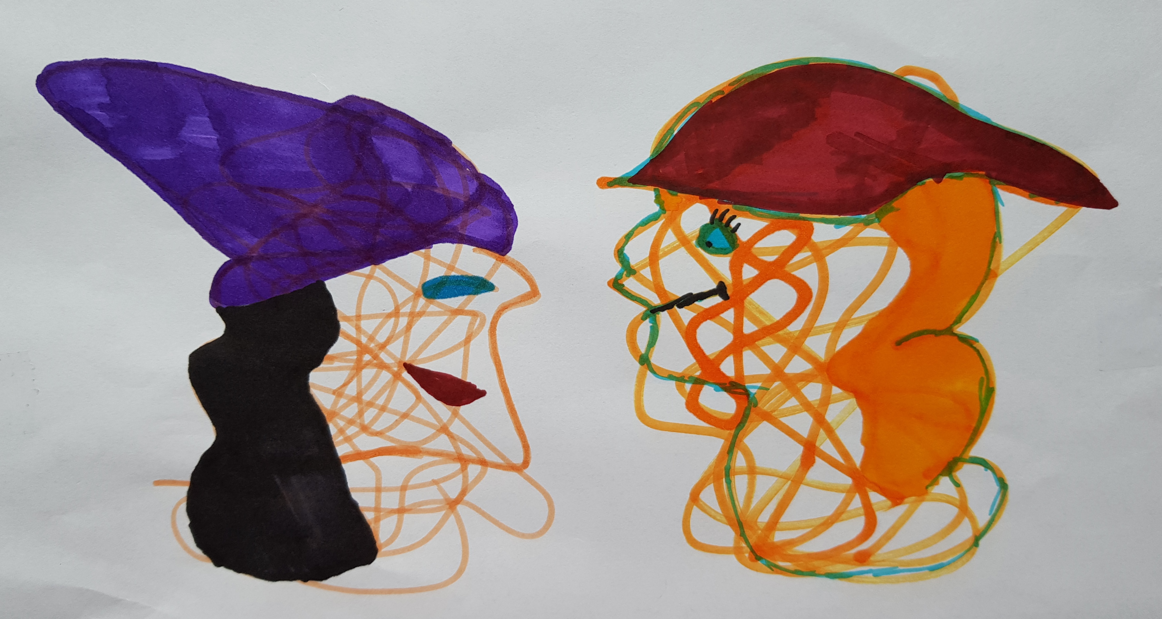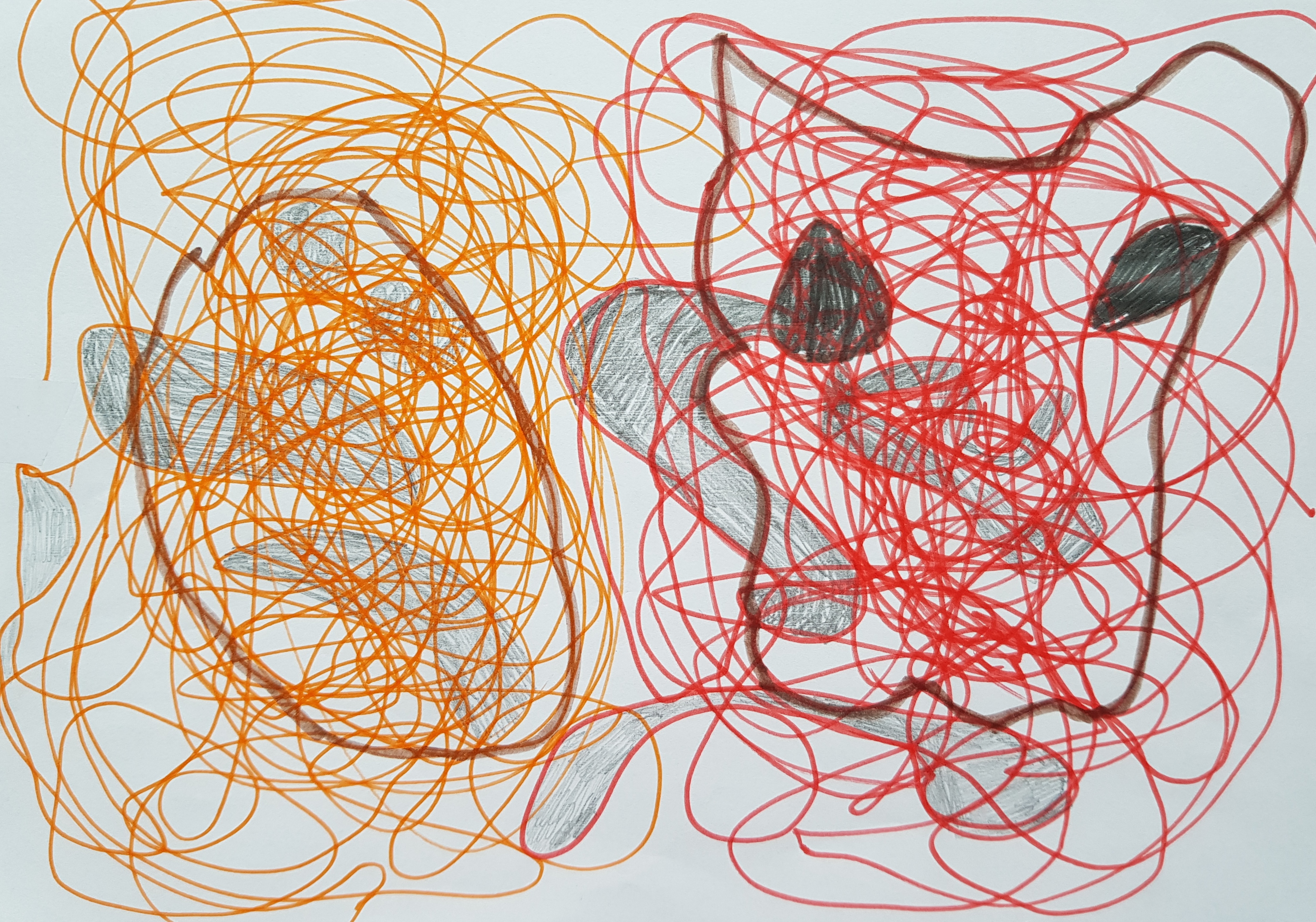 Pažvelgite į šį piešinį. Kaire (darbine) ranka buvo išraizgyta mėgstama šventė – Vėlinės, dešinėje raudonais karakuliais išsiraizgė Helovinas. Ieškant karakuliuose realių objektų, Vėlinių pusėje iš pradžių nevalingai buvo pradėtas spalvinti vaiduoklis. Kada dešinėje Helovino pusėje pasirodė, pasak autoriaus, pusiau demonas, pusiau šuo, jam kilo noras pakoreguoti kairės pusės piešinį, tad jame netikėtai atsirado liūdno žmogaus veidas. Visi žinome, kad liūdesiui su Helovinu tikrai nepakeliui!