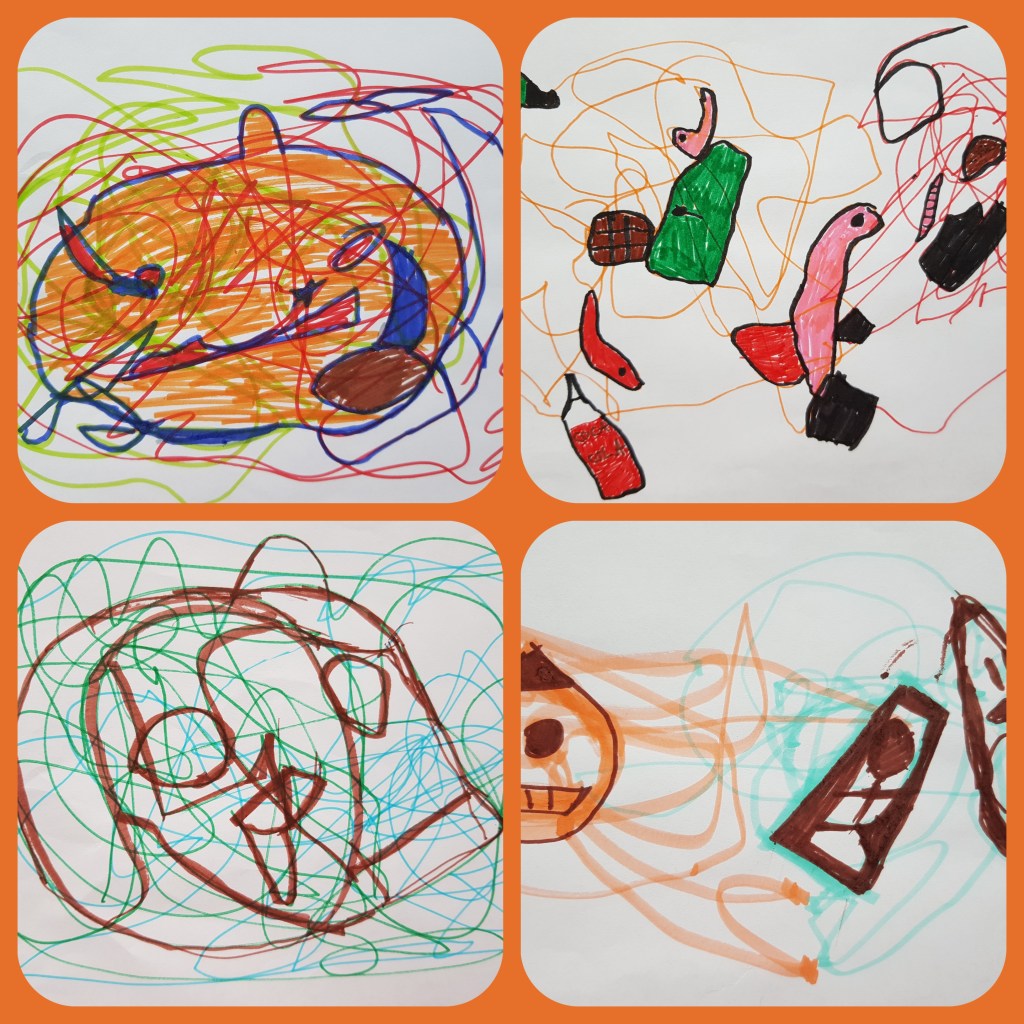 Ne visi darbai padėjo atsiskleisti, tačiau matydama vaikų susidomėjimą neįprastu piešimu, dedu sau pliusą už tai, kad jiems pavyko atsipalaiduoti ir sukurti įdomų dviejų švenčių susitikimą 🙂