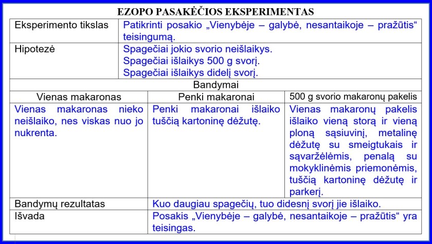 Šiemetiniams skaitytojams posakio „Vienybėje – galybė, nesantaikoje – pražūtis“ teisingumą pasiūliau patikrinti eksperimentu su spagečiais. Į klausimą „Kokį svorį gali išlaikyti spagečiai“, gavau daug vienodų atsakymų – beveik visi vaikai abejojo šios rūšies makaronų tvirtumu ir sakė, kad jie jokio svorio neišlaikys. Vienam mokinukui kilo mintis, kad makaronai gali išlaikyti tiek, kiek sveria visas pakelis, t. y. 500 g. Tik vienas berniukas išdrįso paprieštarauti klasės nuomonei ir pasakė, kad spagečiai išlaikys didelį svorį, tačiau nesugebėjo atsakyti, kodėl taip mano, todėl jo atsakymą prilyginome spėjimui. O spėjimus juk reikia patikrinti!