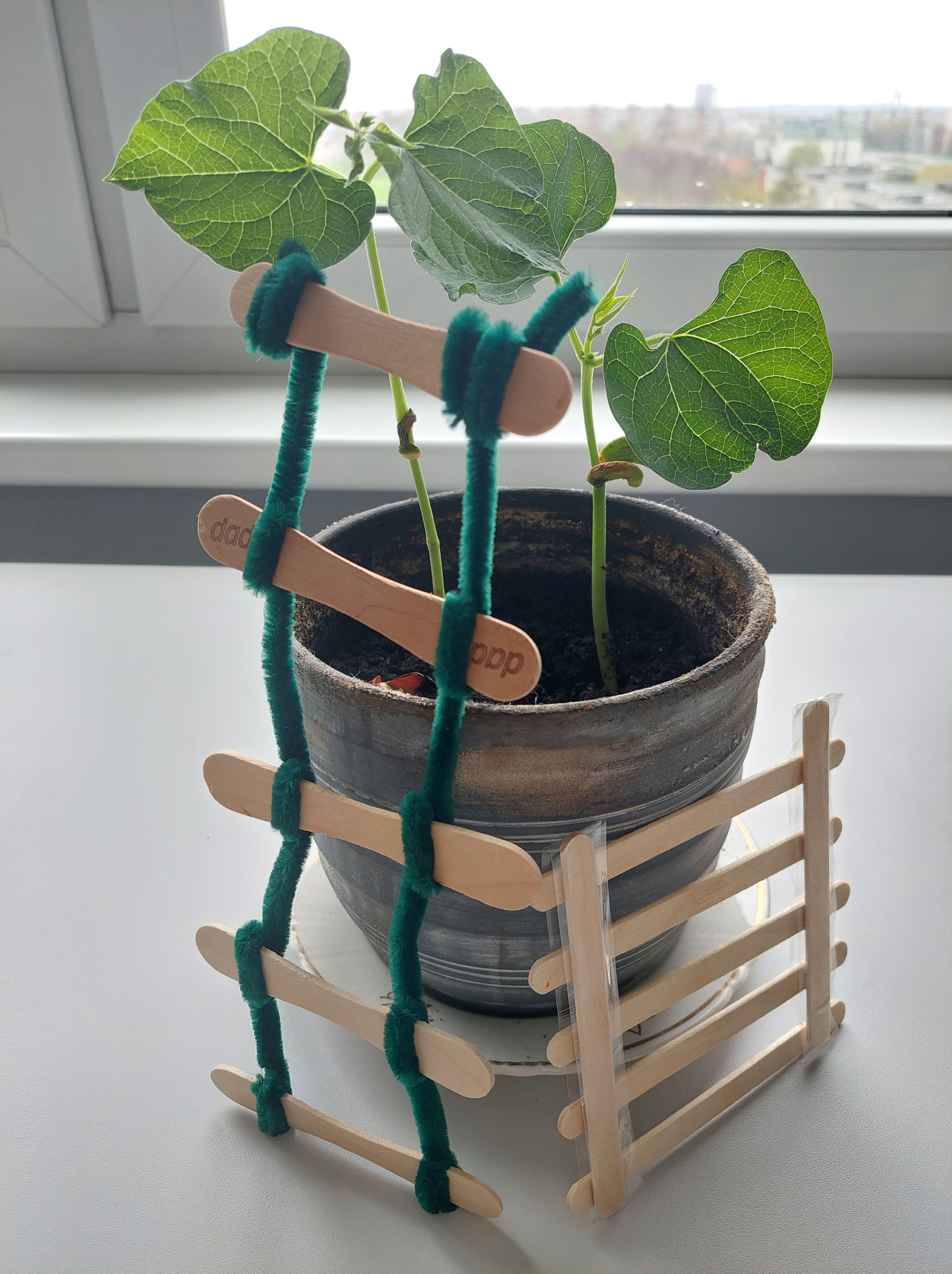 Tačiau pasiūlymas pastatyti kopėčias tikrai buvo netikėtas. Iš pradžių penkerių su puse anūkui leidau pačiam pasirinkti darbo strategiją, bet pamačiusi, kad nei plastilinas, nei lipni juosta nesuklijuoja norimų medžiagų, prisijungiau prie berniuko veiklos. Dviese dirbti buvo smagu, tad netrukus į pupelės vazonėlį atrėmėme dvejas kopėčias. Jei reikės kopėčias prailginti, mažasis inžinierius jau žinos, kokias medžiagas rinktis. Belieka sulaukti pupelės augimo šuolio😉