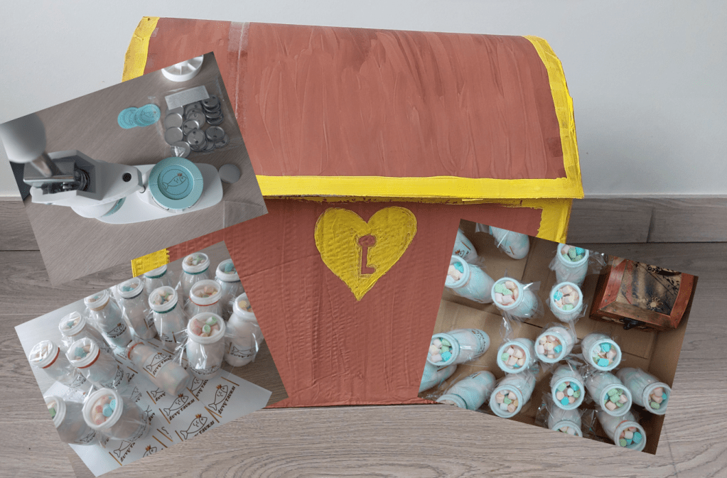 Pakalbėję apie draugystę, pasidalinę pažadais nesipykti, vienas kitam padėti, vaikai išsidalino lobių skrynioje rastas dovanėles – žuvų taukų buteliukus ir ženkliukus – pirmąjį mus vienijantį simbolį. Auksinės žuvelės logotipas leidžia suprasti, kad mes visi akvariume galime tapti auksinėmis žuvelėmis, pildančiomis ne tris, o žymiai daugiau šalia esančių bendramokslių norų.