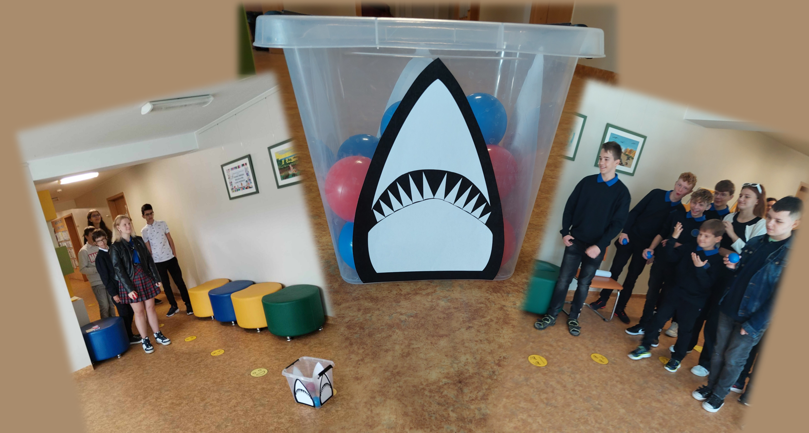 Kitame jūros krante visi papuolė į Ryklių gelmę. Kad rykliai vaikų nepultų, juos reikėjo pamaitinti. Nelabai jauki užduotis😵💫 Kad būtų drąsiau, stovėdami ant emocijų tako išsiskaičiavo pirmais-antrais, pasidalino į dvi grupes ir sustoję vienas priešais kitą bandė sumesti dviejų spalvų kamuoliukus rykliams į nasrus.