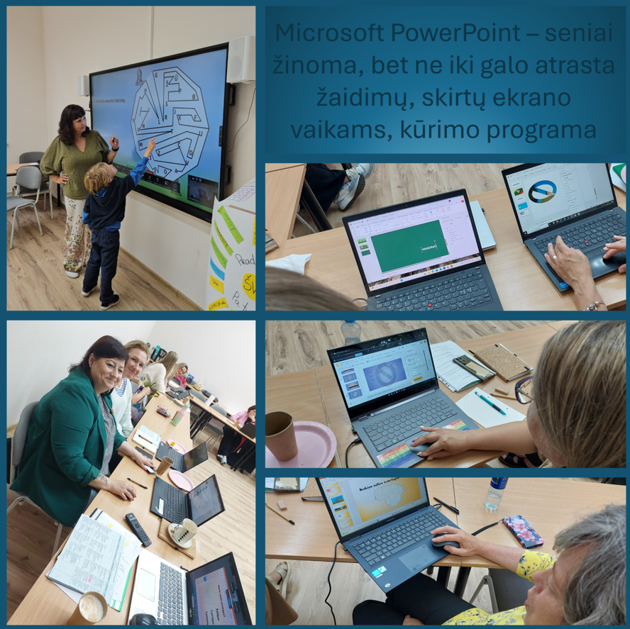 Ketvirtą kartą susitikusi su pasaulio lituanistinių mokyklų mokytojais ryžausi žengti žingsnį atgal ir pristatyti jiems visiems gerai pažįstamą, bet nepelnytai užmirštą Microsoft PowerPoint programą. Nujaučiau, kad pamatę studijų programoje mano mokymų temą kai kas galbūt ir nusivylė, nes mane pažįsta kaip žmogų, kuriantį skaitmeninį turinį įvairiomis nematytomis internetinėmis programomis. Tačiau savo vedamų mokymų metu pastebėjau, kad pasiklydę internetinių programų paieškose ne vienas mokymų dalyvis buvo pamiršęs seną gerą PowerPoint programą, kuri iki šiol daugumai asocijuojasi tik su skaidrėmis parengtu pristatymu. Žengti žingsnį atgal padrąsino ir viešnagės Austrijoje, Vienos lituanistinėje mokykloje „Ratuto“, metu nuskambėjęs mokytojų klausimas, kaip aš padarau, kad skaidrėse įvairūs objektai judėtų, ir mano jaunos kolegės, su kuria dabar kuriame žaidimą įvairiapusių raidos sutrikimų turintiems vaikams, klausimas, ar tikrai ekrane esantys langeliai atsidarinės. Kai aš patvirtinau, kad kiekvienas langelis atsidarys, kolegė nustebusi perklausė, ar tai įmanoma. PowerPoint programa turi daug privalumų. Pirmasis – ja naudojantis nereikia interneto (čia nekalbu apie tuos atvejus, kada į skaidrę yra įkeliamas ne dokumentas ar objektas, bet nuoroda į įvairius internetinius šaltinius), skaidrėmis lengva dalintis, dar lengviau jomis naudotis, skaidrės niekada nedings, kaip dingsta iš internetinės erdvės kai kurios programos, tinklaraščiai ir pan. Į savo kuriamą turinį galima įdėti bet kokią informaciją: tekstus, paveikslėlius, dokumentus, garso, vaizdo įrašus, nuorodas, netgi kitą PowerPoint pateiktį. Ši programa leidžia kiekvieną skaidrę pateikti savitu būdu. Tokios galimybės dauguma internetinių programų neturi – jei kuri kortelių rinkinį, turėsi tik jį; jei pasirinksi atminties žaidimą, jokių papildomų veiksmų be kortelių atvertimo-užvertimo daryti negalėsi; jei norėsis užduoties su atsakymų įrašymu, tokia ji ir bus…