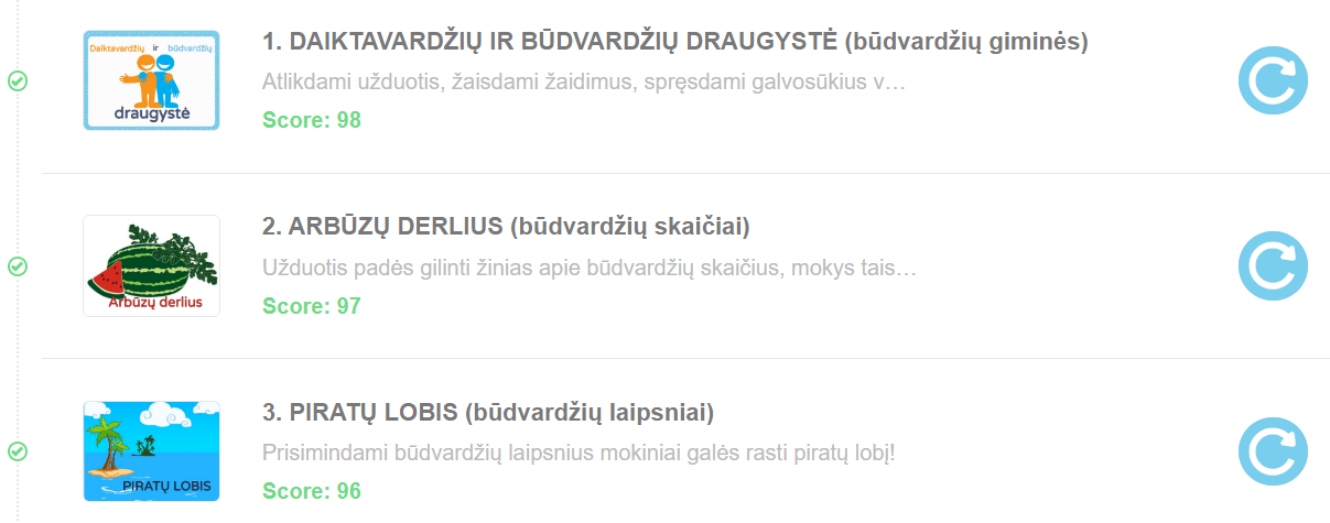 Visus tris žaidimus mokiniai gali žaisti atskirai, skirtingų pamokų ar užsiėmimų metu. Tačiau šį kartą noriu pasiūlyti kitokį darbo būdą – kursą „Būdvardžių kaitymas“. Kuo jis ypatingas? Pirmiausia tuo, kad mokiniai privalo atlikti užduotį iki galo ir surinkti atitinkamą taškų skaičių. Jeigu taškų nesurinks, užduotis neatsirakins ir neleis pereiti prie kitos. Manau, kad ši naujovė paskatins mokinius atidžiau atlikti žaidimų užduotis, nespėlioti, bet pasirinkti tokį atsakymą, kuris nesumažins taškų skaičiaus. Vadinasi, iškilus abejonėms mokinys turės peržvelgti savo užrašus, vadovėlius ar kitą mokytojo pateiktą informaciją, o tada jau drąsiai spausti ant reikiamo langelio, žodžio ar paveikslėlio.