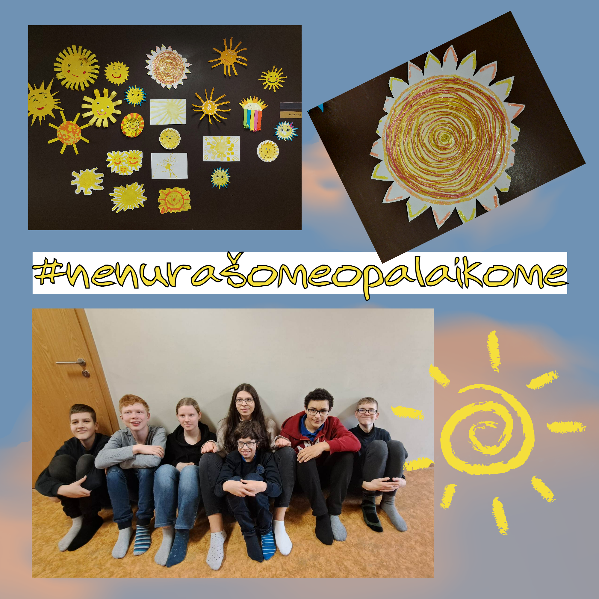 Minėdami Pasaulinę dauno sindromo dieną mokiniai saulytę iš virvučių suko ir klijavo ne vieną savaitę, todėl solidarumas vis augo ir stiprėjo. Šiandien darbai buvo vainikuoti fotosesija, skelbiančia, kad vaikai palaiko visus, kas gyvena po ta pačia saule☀️