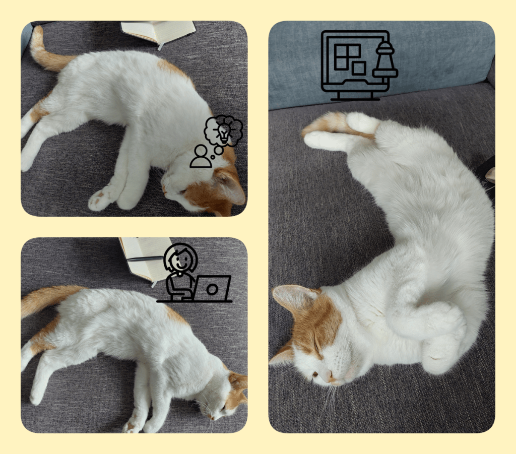 Sakoma, kad naminiai gyvūnai išgyvena visus savo šeimininkų jausmus ir emocijas, pajaučia jų ligas, nujaučia artėjančias problemas. Vertindama savo katės elgesį, dėl ligų šiek tiek abejoju, bet dėl įsijautimo į mano būseną sutinku 100 %. Štai kaip ji šįryt pavaizdavo mano rugpjūtį, kurį pradėjau priimdama dar vieną gyvenimo galimybę: IDĖJA, PROCESAS ir PRODUKTAS😊
